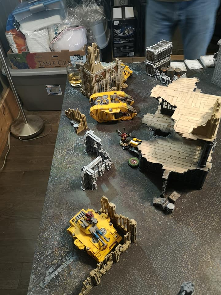 | Not sure what to expect from the new Imperial Fists, the forces of Slaanesh pile into the biggest building for cover. The infantry are sitting on the objective outside the building. |
