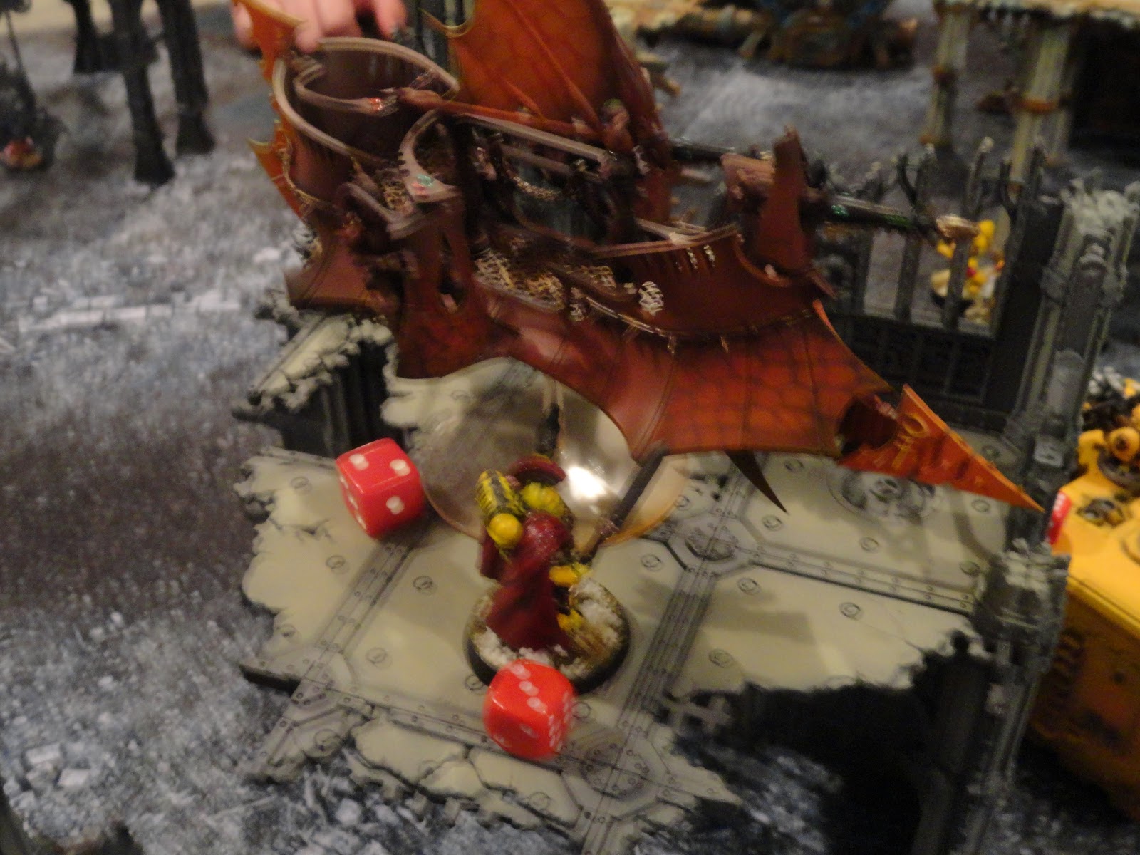 4 Kabalites claim an objective from the two Imperial Fists heroes after they kill the Chaplain with help from the Razorwing.. |